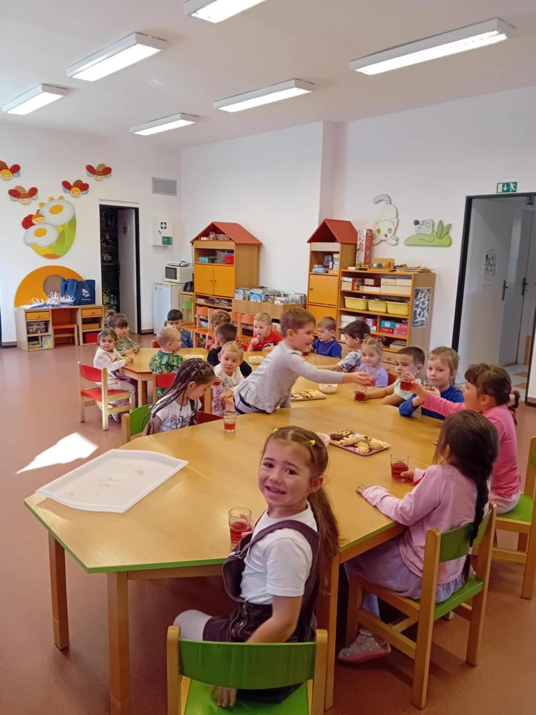 Povídání o Svatém Martinovi vyvrcholilo 11. 11. 2025 svatomartinskou hostinou, na které nechyběly dětmi vlastnoručně upečené svatomartinské rohlíčky. A víno? No jasně, bylo také. :-)