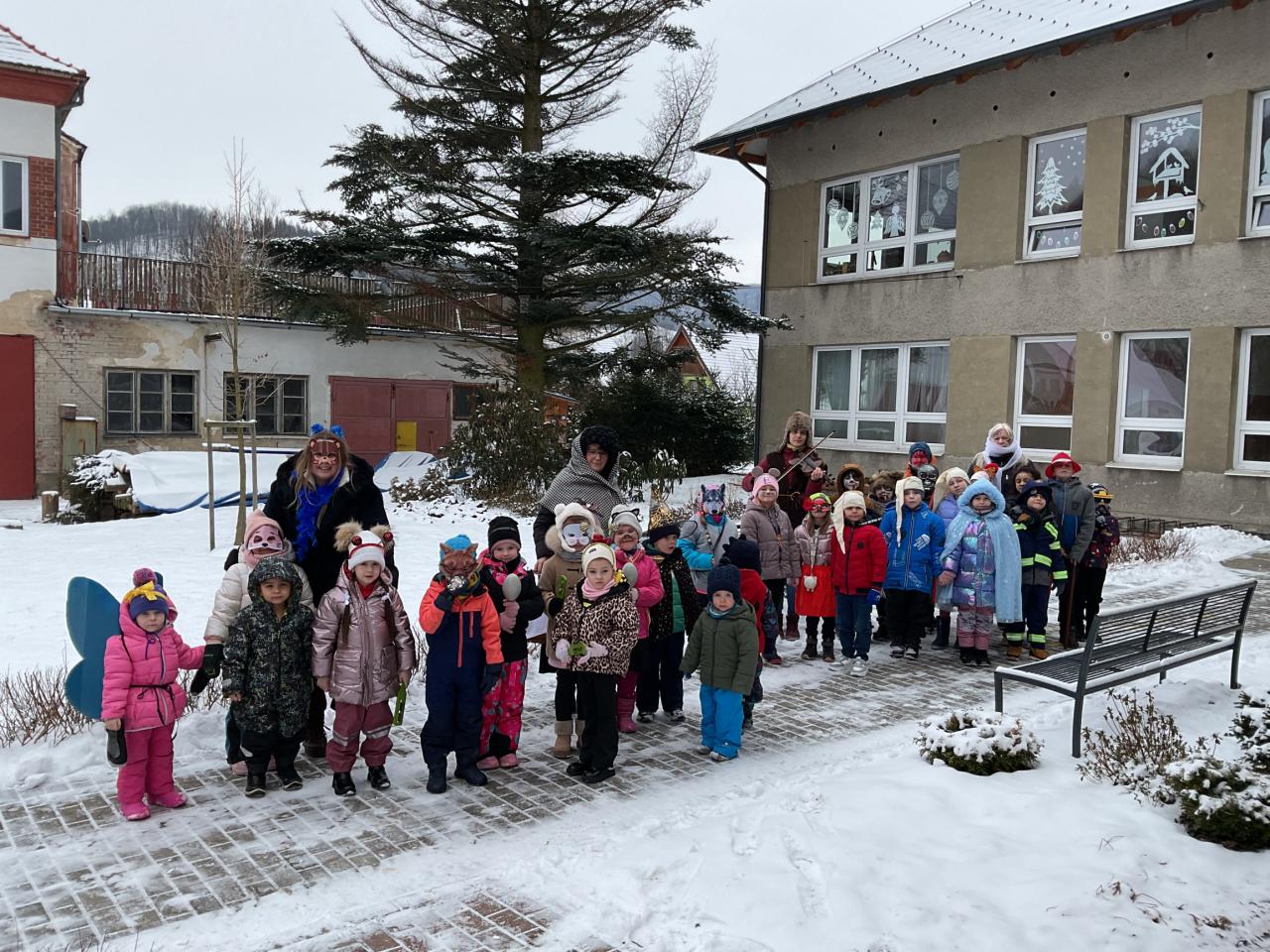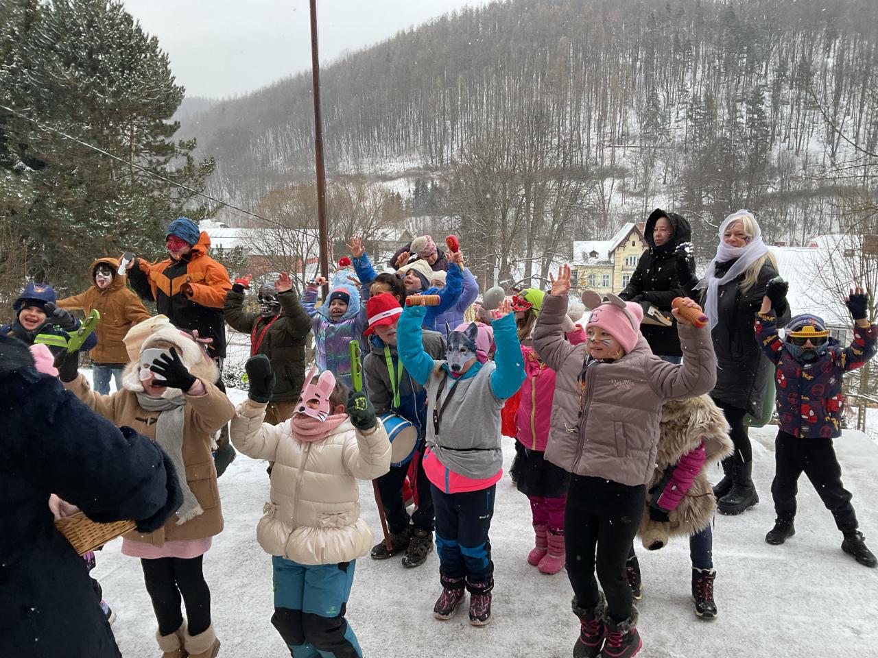 Veselý průvod se zastavil také u budovy základní školy a poté i u několika domů v obci, aby potěšil ty, kteří se nemohli přijít podívat osobně. Největší pozornost však budila postava medvěda, která byla součástí průvodu. Huňatý medvěd neváhal a postupně vyzýval k tanci paní kuchařky, paní ředitelku, paní prodavačky i náhodné kolemjdoucí. Nejedna z nich se s úsměvem zapojila do veselého rejdění a odměnou jí byl bouřlivý potlesk dětí.