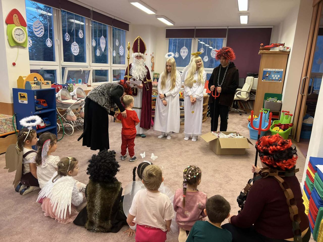 Po návštěvě ve škole se Mikuláš, čerti a andělé vydali také do mateřské školy, kde děti nadšeně přivítaly jejich příchod. Mikuláš rozdával moudrá slova, andělé pohodu a úsměvy – a čerti? Ti na naše nejmenší nepůsobili vůbec strašidelně.