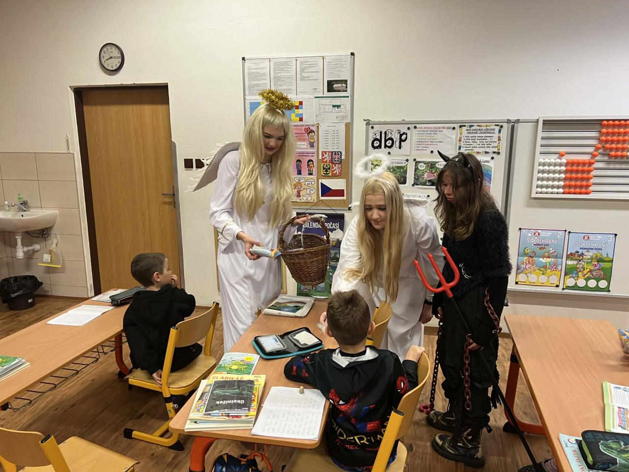 V pátek dopoledne se u nás ve škole objevil Mikuláš se svou tradiční družinou – andělem a čertem. A jak už to bývá, jejich příchod způsobil menší rozruch. Někteří žáci se tvářili, že mají naprosto čisté svědomí, jiní pro jistotu raději nenápadně mizeli do lavic, aby je čert omylem nesbalil do pytle.