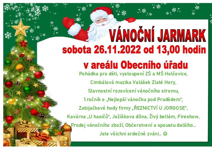 Již tuto sobotu od 13:00 proběhne v areálu OÚ Holčovice Vánoční jarmark. Kromě tradičních trhů, Ježískovy dílny nebo kavárny "U hasičů" se můžete se těšit na vystoupení našich nejmenších a prohlédnout si výtvarnou tvorbu našich žáků.