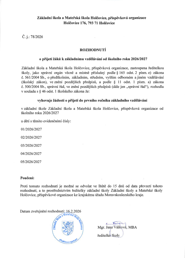 Rozhodnutí o přijetí žáků k základnímu vzdělávání od školního roku 2026-2027 Typ: PDF dokument, Velikost: 50.46 kB